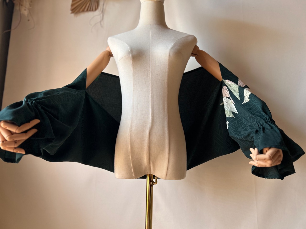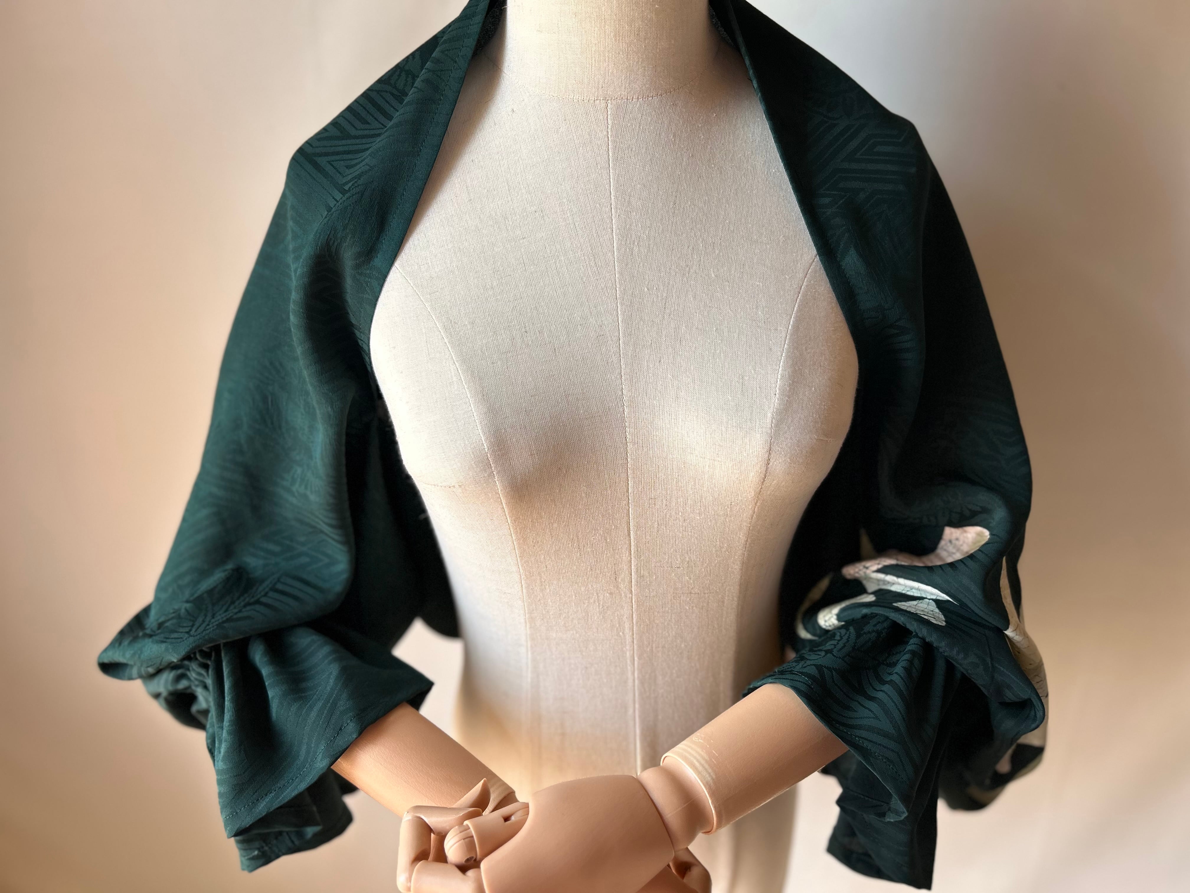 ボレロ「アンティーク着物からのボレロ」!深い緑色のアンティーク着物・正絹から生まれたこのアイテムは、華やかなバルーン袖が特徴で、袖口にはフリルとゴムを施しており、上品さと動きやすさを両立させています。特別な日だけでなく、日常のお出かけシーンにもぴったりなデザインです。